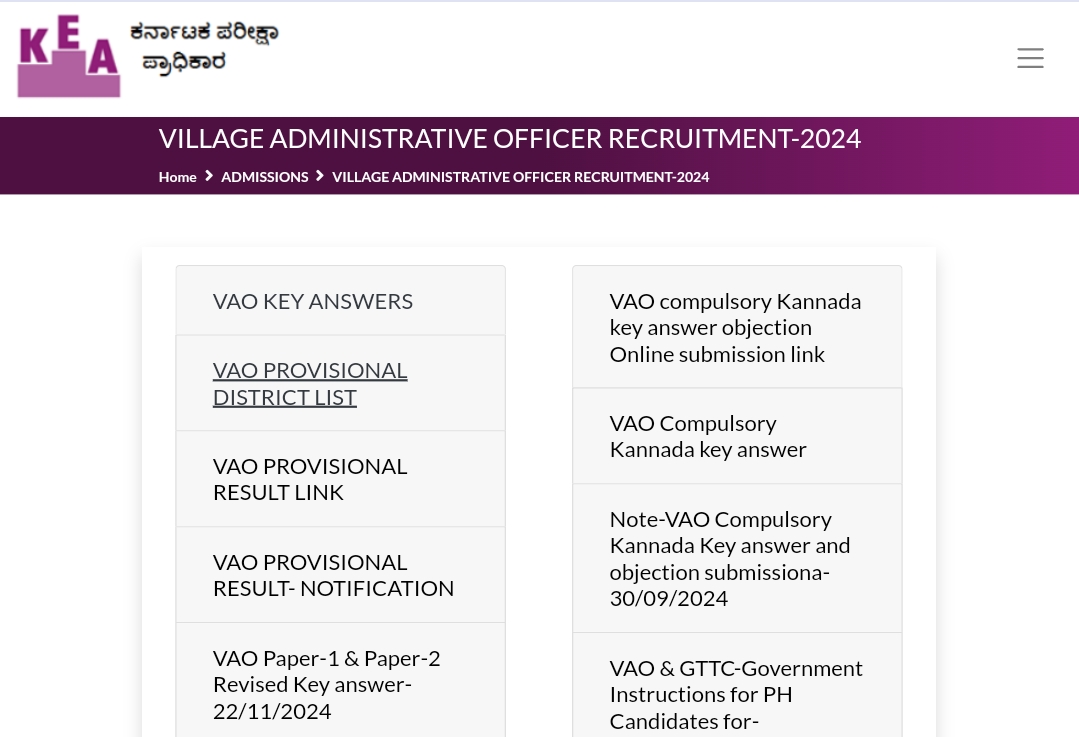 KEA Village Administrative Officer Recruitment Portal – https://cetonline.karnataka.gov.in/kea/vacrec24