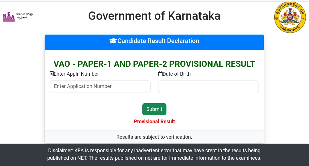 1:15 PM– KEA VAO Provisional Paper 1 & 2 Result 2024 link has been activated today at https://cetonline.karnataka.gov.in/VAOResult/districtpostappliedresult.aspx. Enter Application no. and Date of birth to download the score card.